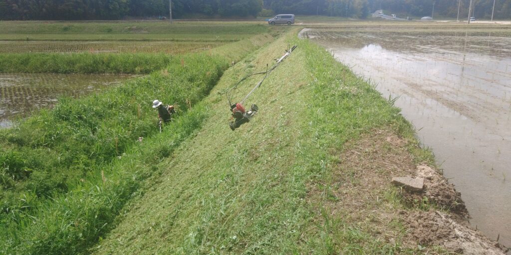 平らに見える田んぼも法面の草刈りは大変です。