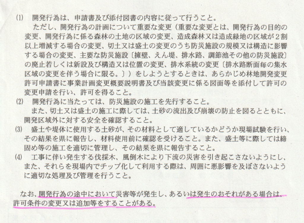 平成31年4月25日に森田知事名で許可された林地開発許可通知書には許可条件について以下のように書かれています。(※印は私の意見です)