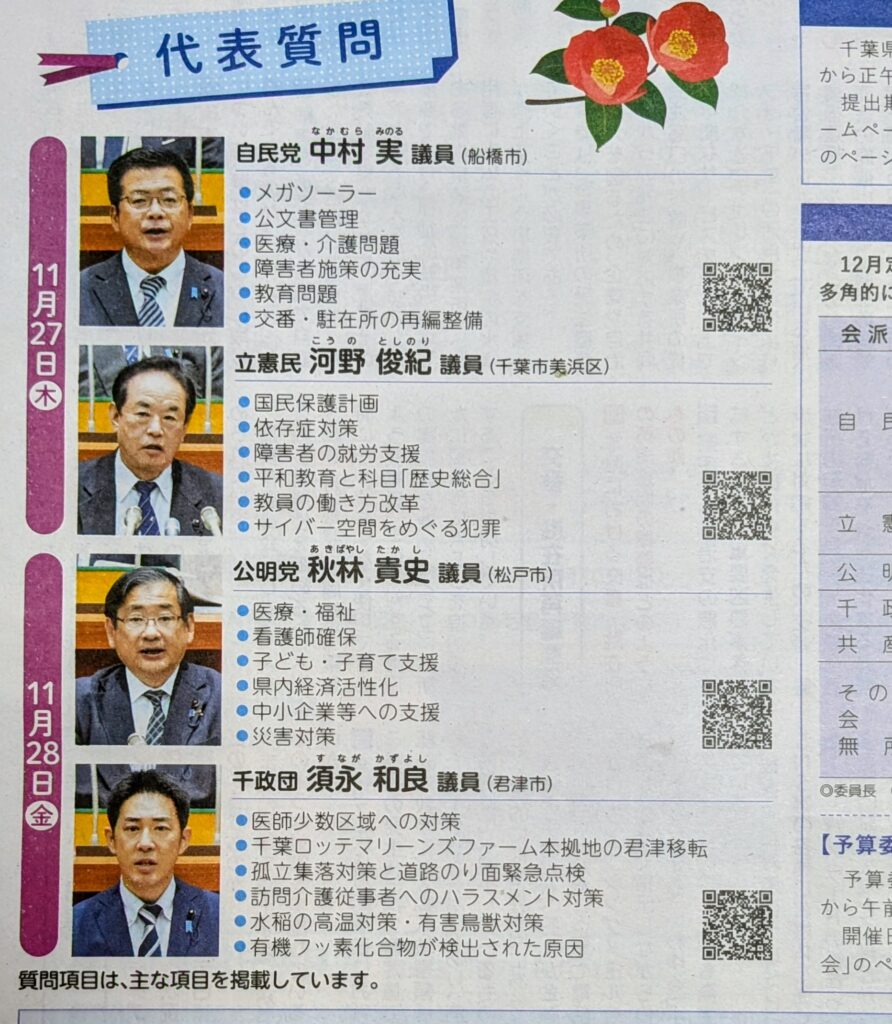表紙には私が登壇した千葉新政策議員団の代表質問の項目が掲載されているほか、2面には千葉ロッテファーム本拠地移転に関する質問と答弁が掲載されています。