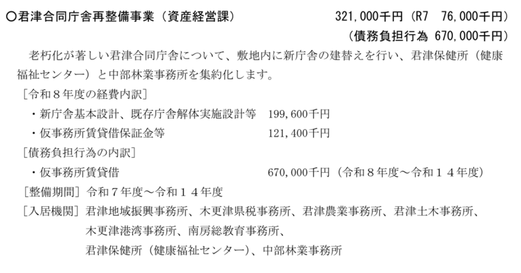 君津合同庁舎の建て替え設計が始まります! 2026/3/6 2026/3/6 23.県政, 51.公共施設, 51.公共施設マネジメント木更津市潮見にある君津合同庁舎を建て替えるため、設計業務が始まります!君津中央公園横にある中部林業事務所や木更津にある君津保健所も入る建物となります。工期は令和14年度まで、令和15年から供用予定です。